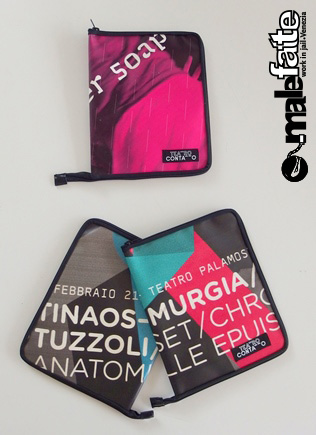 Pratico astuccio in PVC riciclato delle stagioni Teatro Contatto, chiusura zip nera, alette laterali per facilitare l’apertura, ideato e realizzato nel carcere di Venezia da Malefatte – Rio Terà dei Pensieri