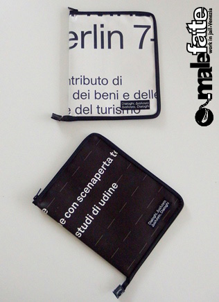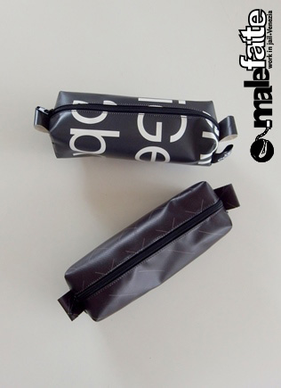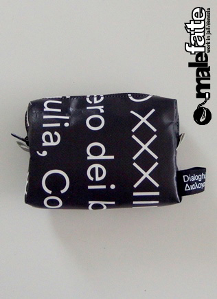 Pratico astuccio in PVC riciclato del progetto Dialoghi-Residenze delle arti performative a Villa Manin, chiusura zip nera, alette laterali per facilitare l’apertura, ideato e realizzato nel carcere di Venezia da Malefatte – Rio Terà dei Pensieri