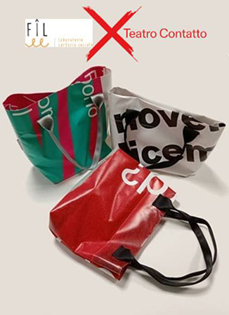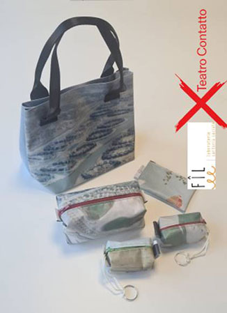 Borse e accessori in PVC riciclato delle stagioni Teatro Contatto, ideati e realizzati da FÎL laboratorio sartoria sociale, un progetto del Centro Caritas dell’Arcidiocesi di Udine ONLUS