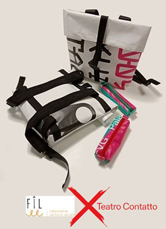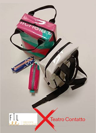 Zaini e astucci in PVC riciclato delle stagioni Teatro Contatto, ideati e realizzati da FÎL laboratorio sartoria sociale, un progetto del Centro Caritas dell’Arcidiocesi di Udine ONLUS Prezzi: da 5,00 € a 25,00 €