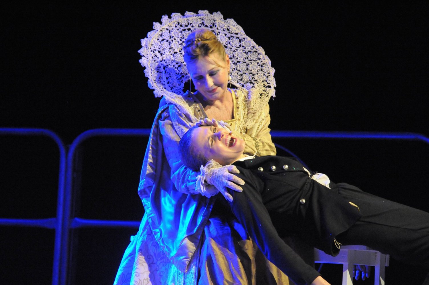 Manuela Kustermann, giovanissima Ofelia nell’Amleto di Carmelo Bene, primadonna dell’avanguardia teatrale, una ventennale esperienza con Gianfranco Nanni e attuale direttrice del Teatro Vascello di Roma -produttore dello spettacolo- e Melania Giglio, diplomata allo Stabile di Torino, attrice per Ronconi e che ricordiamo fra le attrici dell’Ecole de Maitres diretta da Alfredo Arias, osservano con dolcissima compassione la fatale caducità del nostro tempo terreno, in una conversazione che supera le epoche.