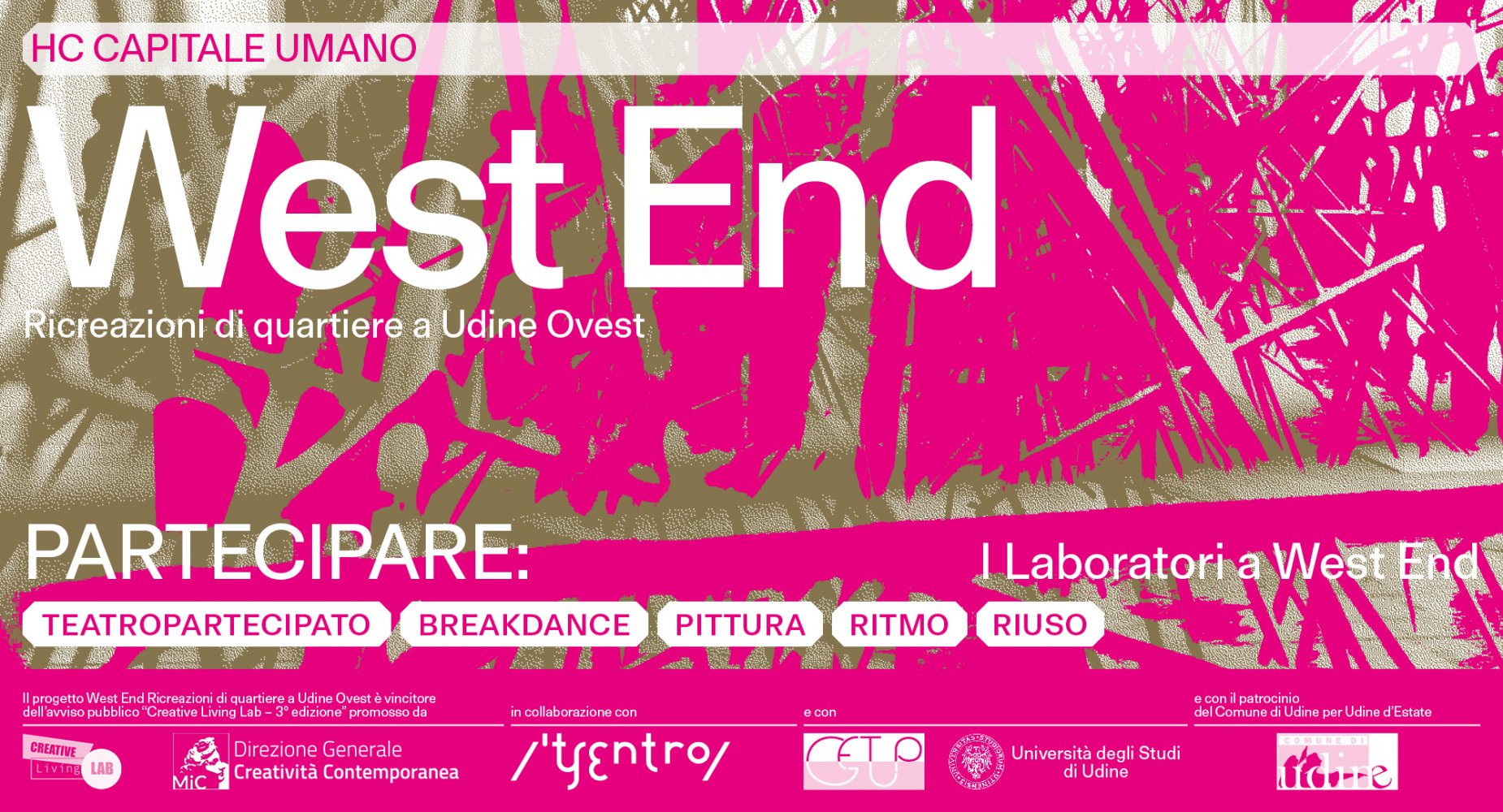 Le Ricreazioni di quartiere West End a Udine Ovest proseguono con 4 laboratori gratuiti aperti alla cittadinanza. Le attività programmate nei quartieri San Domenico, Villaggio del Sole e Rizzi fanno parte di WEST END progetto vincitore dell’avviso pubblico “Creative Living Lab – 3 edizione” promosso dalla Direzione Generale Creatività Contemporanea del Ministero della Cultura, ideato da  Associazione Culturale HC Capitale Umano – Udine in collaborazione con CSS Teatro stabile di innovazione del FVG con Punto Luce – Get up e Cas*Aupa e con Università degli Studi di Udine con il patrocinio del Comune di Udine per Udine Estate