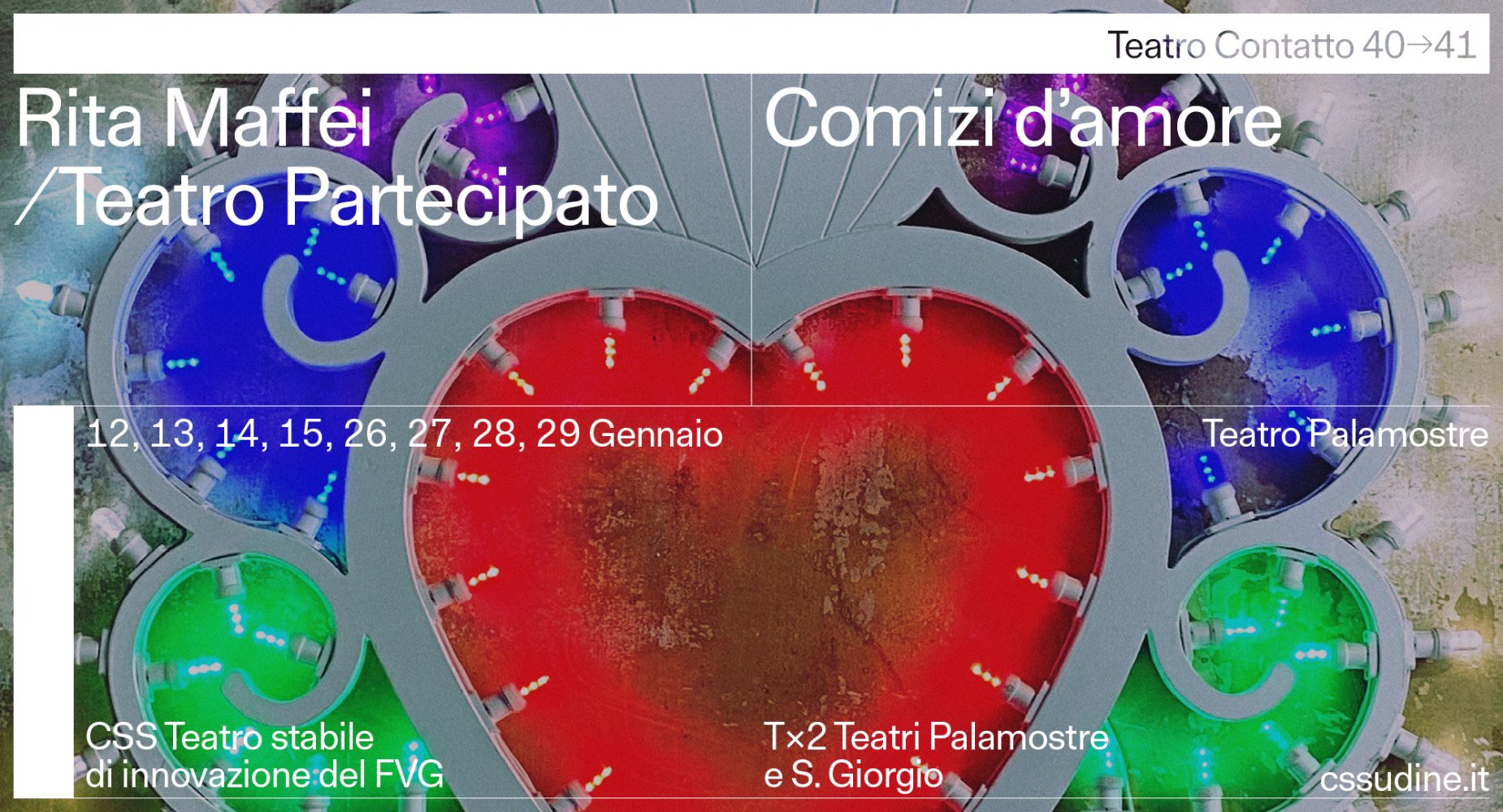 È stato posticipato il debutto di Comizi d’amore, lo spettacolo di Teatro partecipato ideato e diretto da Rita Maffei per la Stagione Teatro Contatto 40 in programma dal 24 novembre al 18 dicembre. Il CSS Teatro stabile di innovazione del FVG a causa di un caso di positività Covid19 nella compagnia si vede costretto a rimandare la data di debutto dello spettacolo a:
