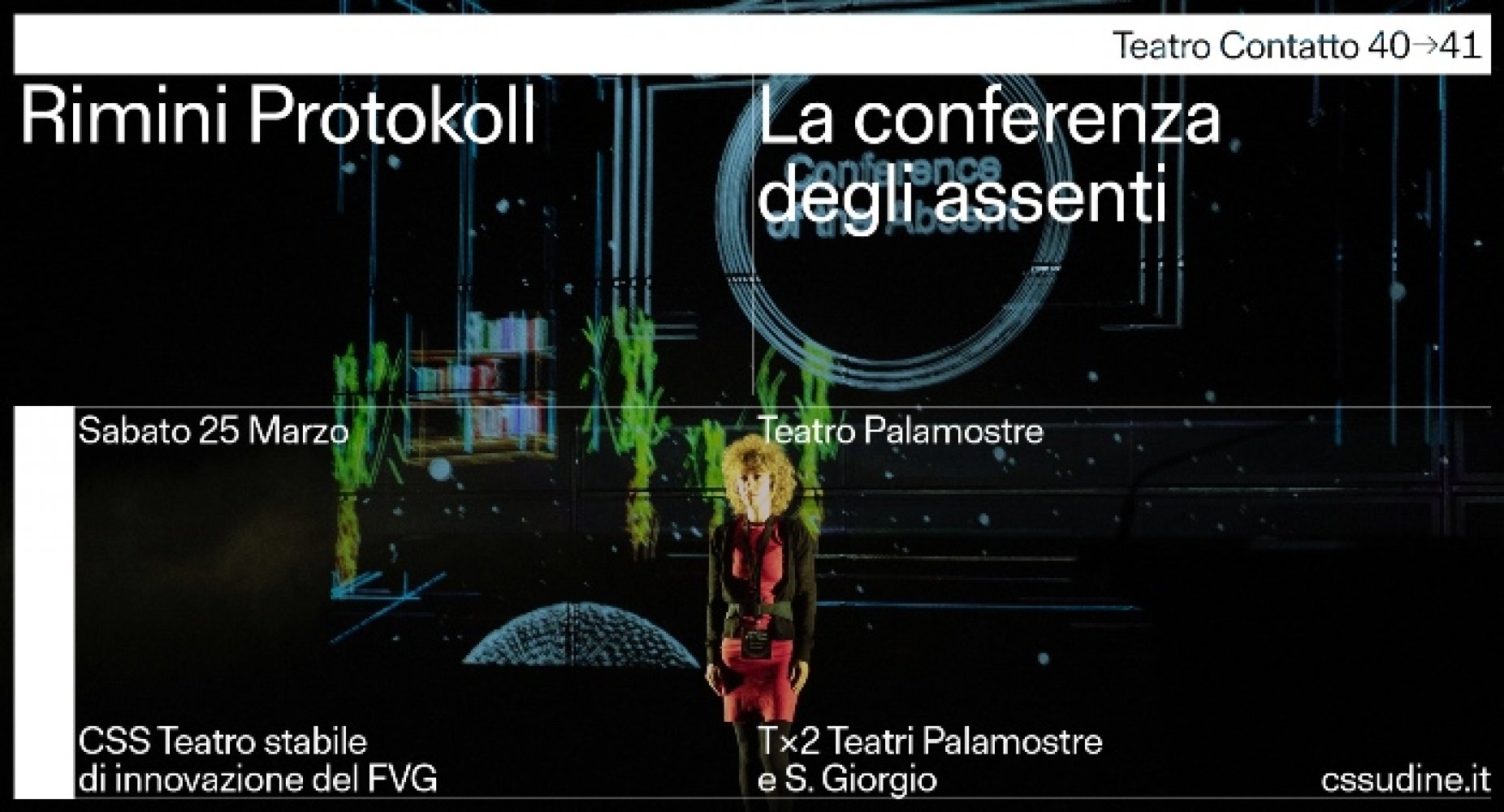 La compagnia berlinese e collettivo artistico Rimini Protokoll, formato da Helgard Haug, Stefan Kaegi e Daniel Wetzel caratterizzato da un’incessante sperimentazione dedicata alla scoperta e all’elaborazione di nuovi linguaggi e formati artistici, debutta sabato 25 marzo ore 20.30 al Palamostre per la Stagione Teatro Contatto con la versione costruita per Udine della performance La conferenza degli assenti in tournée in città europee e internazionali: Belgrado, Bruxelles, Lisbona, Lussemburgo, Madrid, Roma, Biennale di Architettura di Venezia, Praga, Santiago del Cile, Parigi, Messico, Seoul, Berlino, Instanbul.