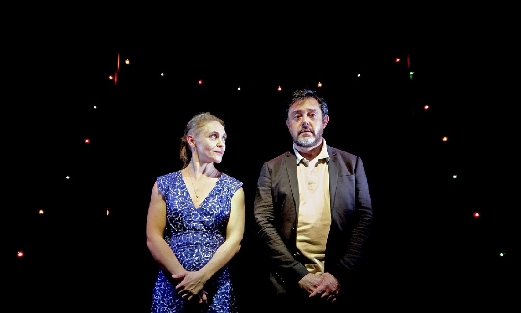 Una donna e un uomo in piedi, interpretati, a Udine, dall’attore Marco Cavalcoli, vincitore del premio UBU 2022, e dall’attrice Caterina Simonelli, in uno spazio incorniciato solo da un festone di lampadine colorate, giocano per un’ora ad avanzare ipotesi più o meno paradossali sugli scenari che attendono il genere umano. Visioni utopiche e distopiche, scenari fantascientifici, incubi politici e fantasie assurde, che finiscono, a poco a poco, per disegnare un affresco straordinariamente ricco e preciso delle speranze e delle paure della nostra epoca.