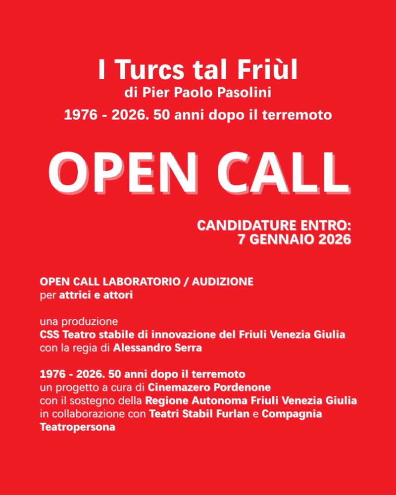 Il CSS indice un laboratorio/audizione in programma il 22, 23 e 24 gennaio 2026 al Teatro Palamostre di Udine dalle 10.30 alle 18.30 (un’ora di pausa pranzo).