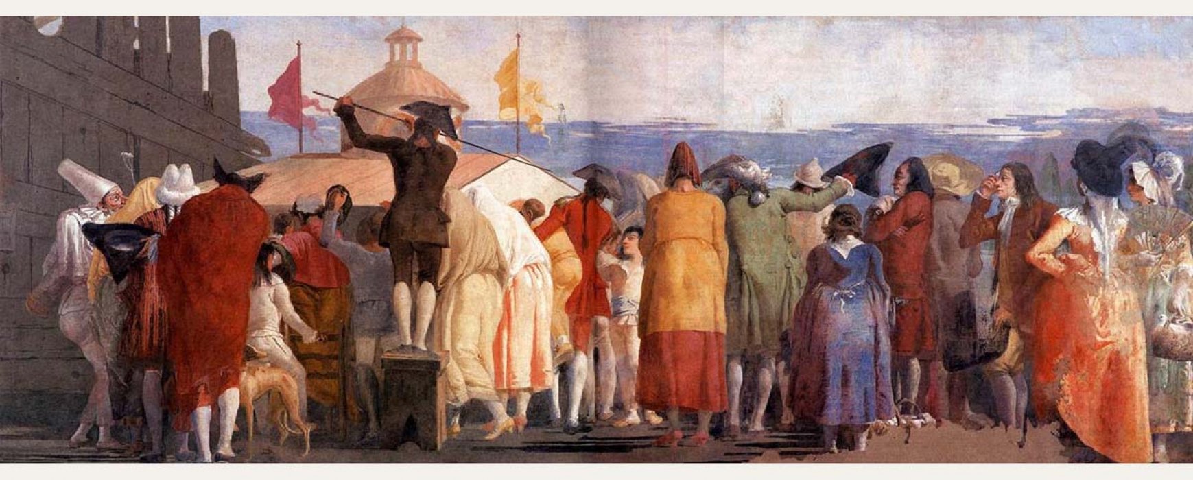“Nella pittura del Tiepolo – Il mondo novo - una folla indistinta, ma con all’interno presenze emblematiche, è radunata per ammirare un cosmorama, innovativo dispositivo ottico che lascia intravedere paesaggi esotici con giochi di luci, riflessi e proiezioni. I personaggi sono raffigurati tutti di schiena, eccetto un fanciullo e un pulcinella, lasciando emergere un senso dell’infinito, visibile nei dettagli dello sguardo e dell’attesa.