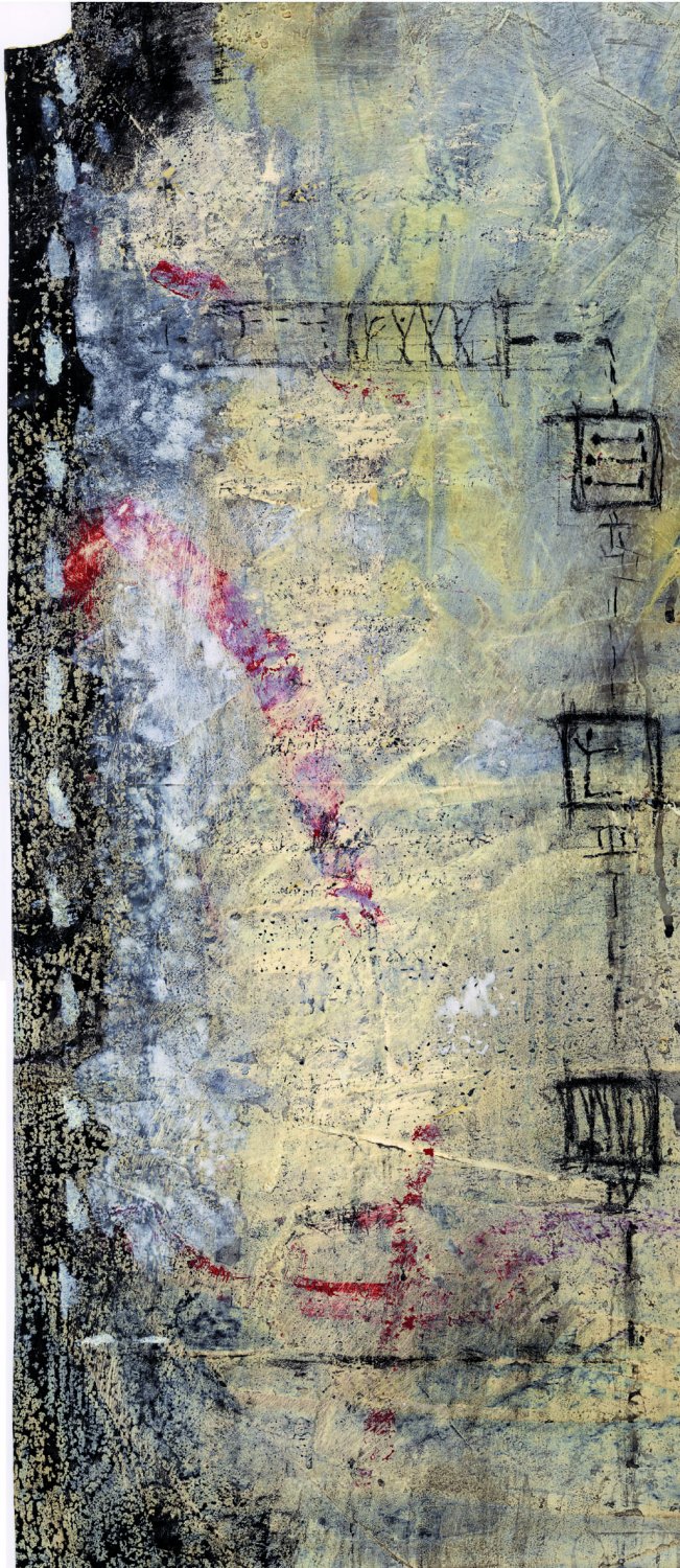 Attraversata dalla sintesi figurativa delle pitture rupestri ai ricordi di civiltà ormai remote, il mio lavoro è sempre stato il risultato di studi su ciò che il segno, nella sua storia, racconta; dall’arte primitiva, agli affreschi delle case africane, dai graffiti ai segni del tempo passato, di civiltà o di singoli individui che hanno raccontato o raccontano degli eventi. In Tracce di un sacrificio il segno del tempo è raccolto sulle pareti, pareti che hanno vissuto ciò che l’uomo ha vissuto, pareti che conservano gelosamente i simboli di una storia accaduta o che sta per accadere. In questo caso la storia è crudelmente magica, noi guardiamo questi segni ripercorrendo un viaggio che, per quanto si possa immaginarne la fine, nasconde sempre un’entità talmente forte che non permette alla vita di interrompere il suo percorso.