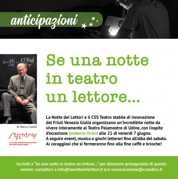 Se vuoi partecipare e diventare anche tu protagonista di Se una notte in teatro un lettore…, scrivici a info@lanottedeilettori.it e/o comunicazione@cssudine.it www.lanottedeilettori.it