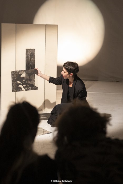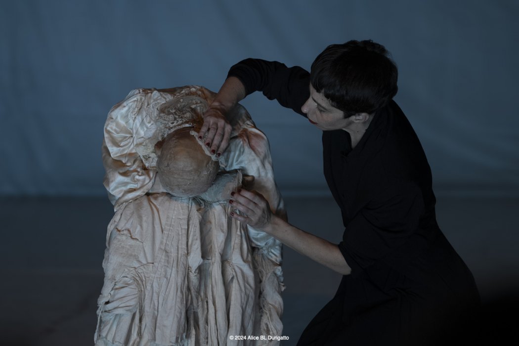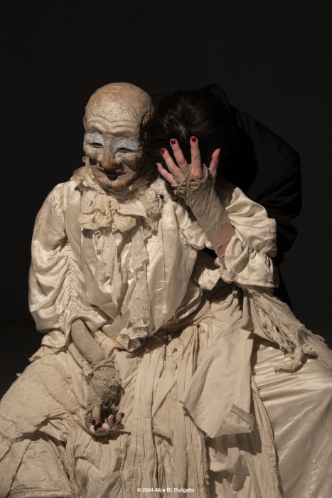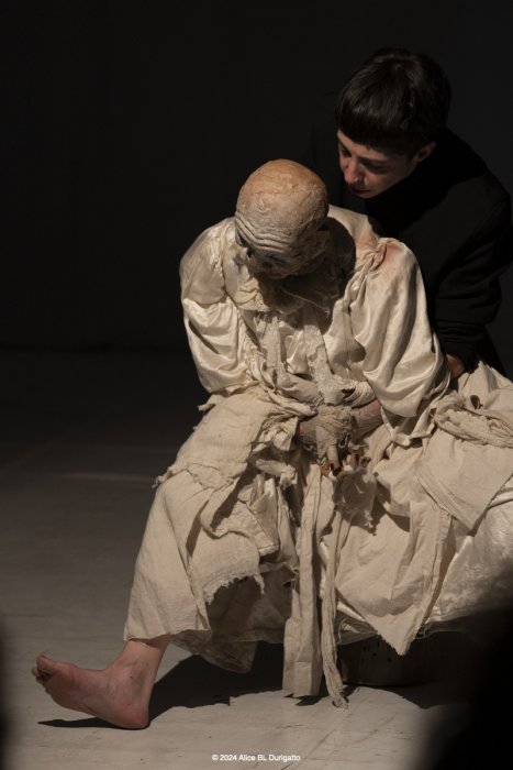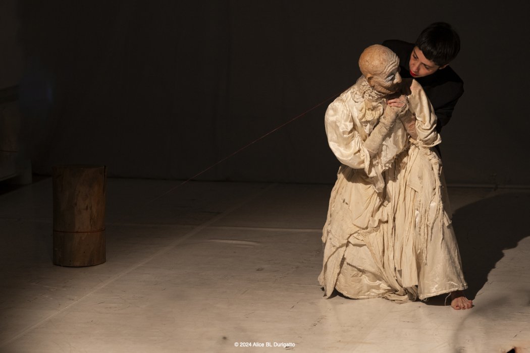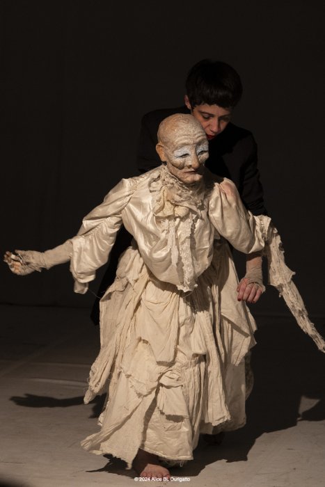 Nato come omaggio al danzatore di butô Kazuo Ono, che iniziò a danzare a 51 anni e non smise fino alla sua morte a 101, è diventato - nel corso delle diverse tappe di residenze - un lavoro che si interroga anche sul Sacro, sul senso di quello che ci mette in relazione con l'inizio e con la fine della vita, sulle possibilità di essere generative e sulla necessità del distacco. Centrale è la relazione tra la marionetta, K., e il suo doppio, la marionettista, un rapporto di interdipendenza che rimanda al legame madre - figlio. L’effetto combinato della manipolazione a vista crea uno sdoppiamento, una drammaturgia complessa in cui si mischiano inquietudini e fantasmi.