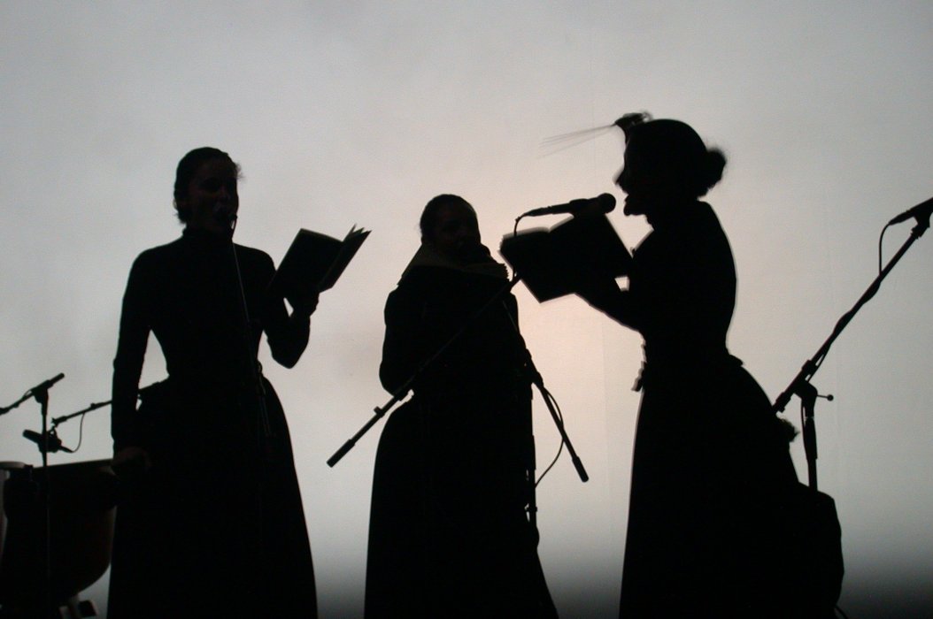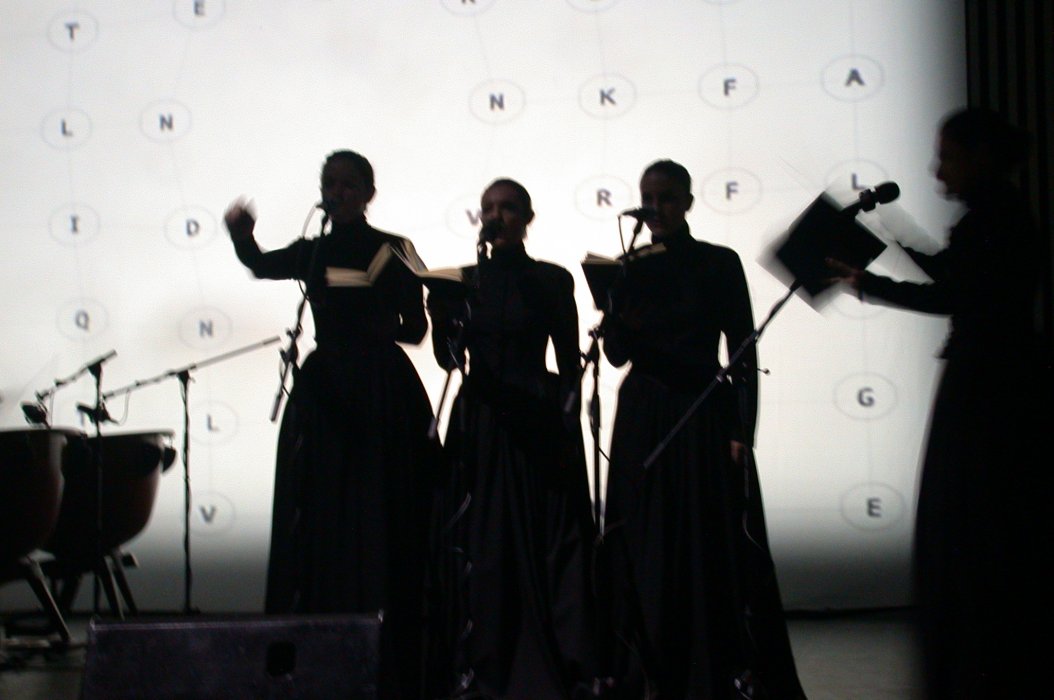 Cryonic Chants offre un ascolto radicale e selvaggio, sonda terreni misteriosi, frutto della ricerca che da anni stanno conducendo assieme Chiara Guidi - anima e fulcro della compagnia fondata negli anni ottanta assieme ai fratelli Castellucci - e Scott Gibbons, statunitense e prolifico compositore della micro musica e musica d’ambiente. Il concerto ha come sostanza canti e poemi oggettivi per quattro voci femminili, quattro attrici e corifee contemporanee, mentre il protagonista di un video proiettato su grande schermo è una capra nera. Se la tragedia - che più volte la Raffaello Sanzio ha indagato - è “canto del capro”, come capro espiatorio, qui l’animale è poeta, creatore di senso, corpo della scrittura.