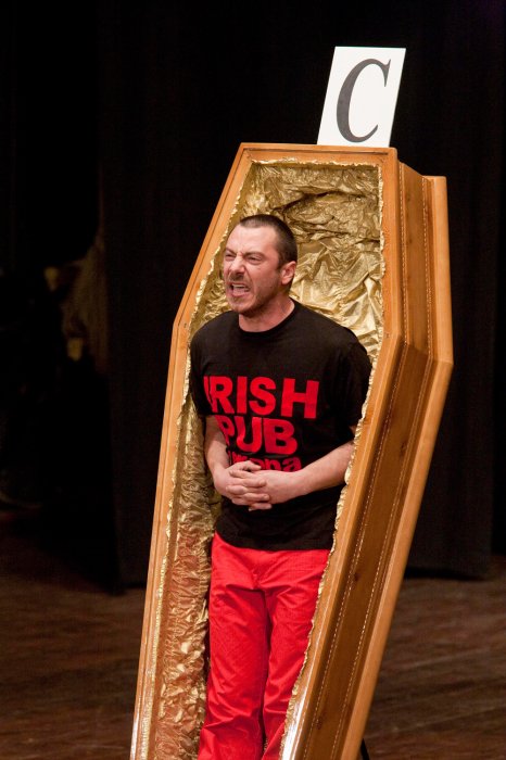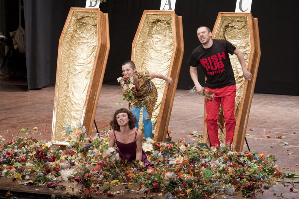 [...] un gergo crudo e crudele, tre storie di fantasmi inquieti, un serial killer inseguito dalla polizia, una madre e una figlia separate e chiuse nelle rispettive desolazioni, che si intrecciano nelle ultime ore di vita e in un aldilà a luci rosse. Ma il giovane gruppo veronese ha fatto un vero miracolo. Nessun prevedibile realismo, di reale solo tre bare vere, che un servo di scena scoperchia e il terzetto composto da Enrico Castellani, Valeria Raimondi e Ilaria Dalle Donne, dà fiato alle pene. Lo slang dublinese nell'incalzante riscrittura diventa un flusso ruzantiano trash di lega padana, etilico e anfetaminico. Un pugno nello stomaco assestato con guanti felpati d'intelligente ironia iconoclasta.