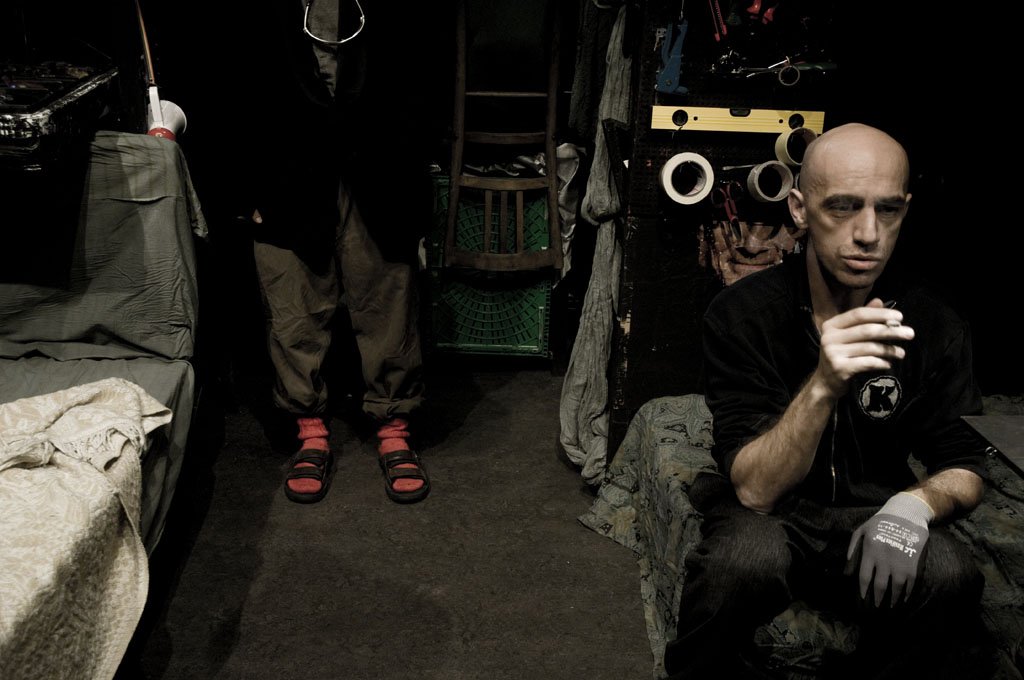 Nel chiuso di un tugurio pieno di cianfrusaglie, spifferi e infiltrazioni d’acqua piovana, un vecchio barbone trova un riparo grazie a un giovane uomo, psicolabile, che abita lì. Un altro giovane uomo, il proprietario del tugurio, va e viene. Il luogo sembra una zona franca al riparo dalle regole spietate e selvagge della società, ma in questo microcosmo si riproducono quegli stessi rapporti violenti che scandiscono la vita nel mondo esterno.
