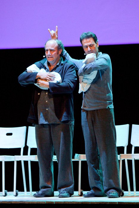 Due uomini – amici, nemici, sconosciuti - incrociano i loro destini sul ciglio di una strada, in un rumoroso nido d’ospedale, su una panchina al fresco di un parco, nell’asetticità di un call center, in una sala d’aspetto, in una vitalissima bocciofila, o sul cornicione di un palazzo. Luoghi sospesi a mezz’aria fra il serio e il faceto; luoghi in cui l’aria che si respira è a volte dolce, altre volte salata. Ale e Franz – Alessandro Besentini e Francesco Villa, il duo inossidabile protagonista di mille sketch della panchina a Zelig e Mai dire gol, i folgoranti improvvisatori senza copione di Buona la prima - costruiscono con Aria precaria un’incessante sequenza surreale di incontri, scontri, attese. Dieci quadri, dieci fasi della vita, su cui ridere, sorridere, riflettere.