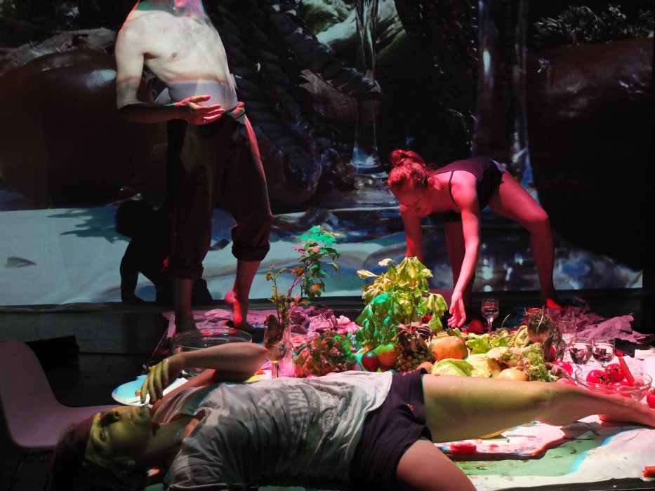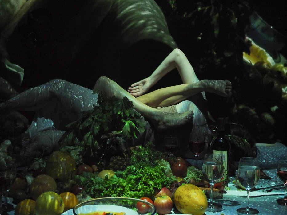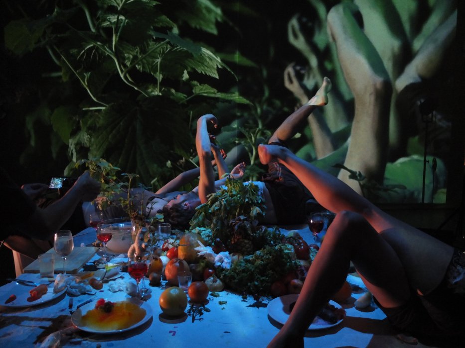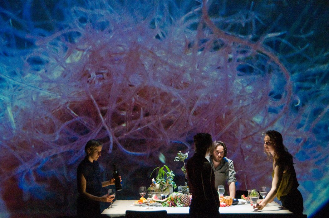 Un dinner party si trasforma in un viaggio avventuroso attraverso le molteplici dimensioni del macro e del microcosmo. Immagini riprese dal vivo dalle telecamere degli stessi performer ci catapultano in bizzarri mondi paralleli dell’universo organico. Molteplici effetti di ripresa e manipolazioni acustiche contribuiscono ad evocare metafore di giardini barocchi, delizie della Terra da cui traspare il suo più attuale e inevitabile collasso. Una società che si fa guidare dal desiderio e dalla curiosità, smagliante ma anche inaridita, celebra la sua stessa transitorietà nelle molteplici dimensioni della realtà che esplodono su un grande schermo. In questo still-life ogni azione o comportamento umano viene inesorabilmente assorbito dall’opulenza della natura.