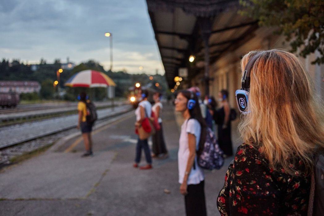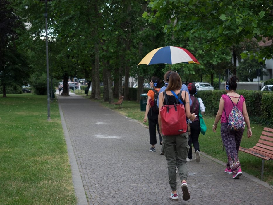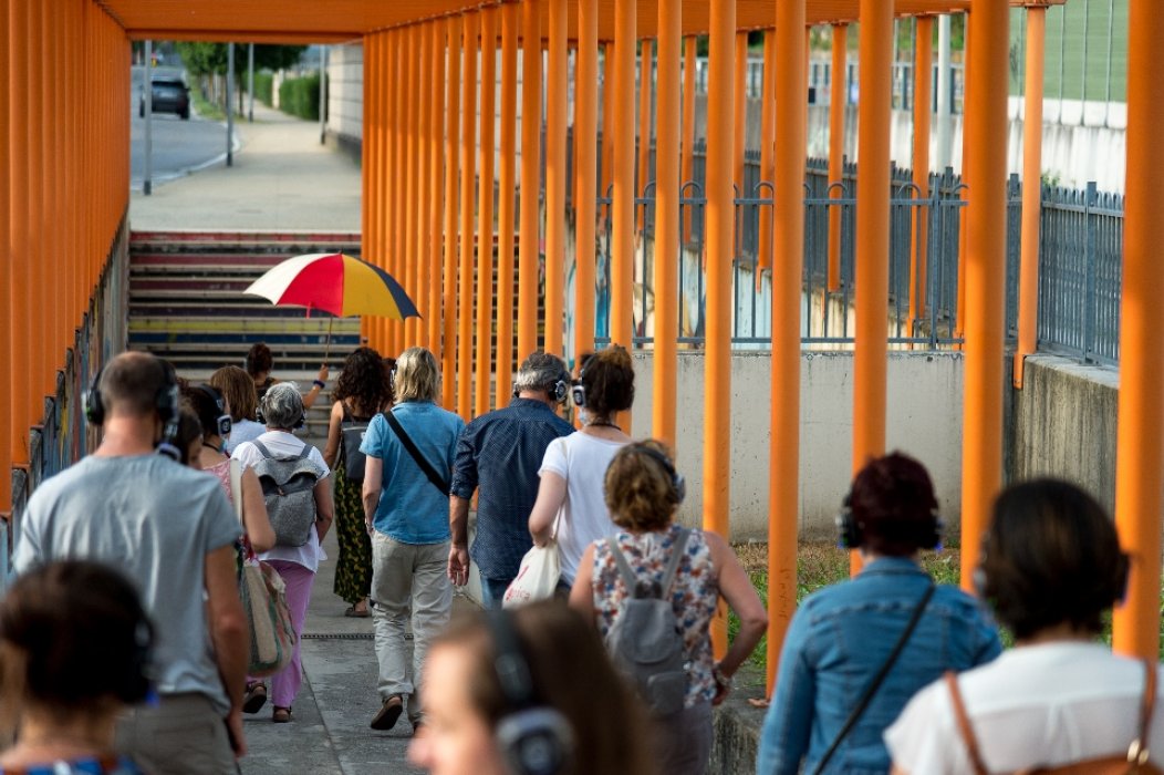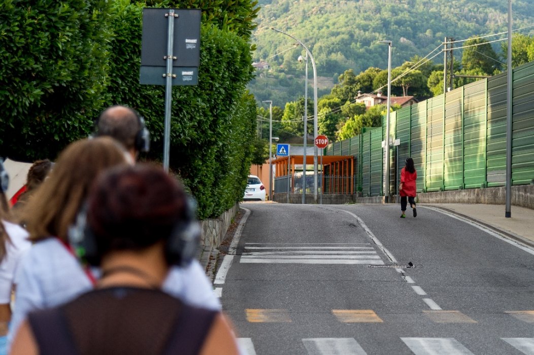 Dotato di cuffie, il pubblico cammina per la città e sfoglia mentalmente un album di voci, suoni, frammenti poetici e testimonianze, vivendo un’esperienza individuale e condivisa allo stesso tempo. Due figure accompagnano il gruppo: la prima guida il percorso; l’altra appare, scompare, gioca con i limiti.