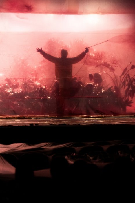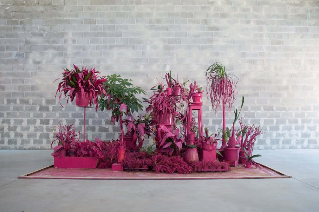Questo lavoro nasce dalla volontà pittorica di creare un’immagine vera e contemporanea del mondo che ogni giorno abito e respiro. Un’opera che descriva con esattezza la cultura del mio tempo e possa essere trasfigurazione simbolica, poetica di un’epoca che io ritengo fortemente apocalittica. Questa credo sia la funzione dell’arte, farsi sintesi formale di un vago sentire comune. Un uomo solo, davanti al paesaggio, un paesaggio vegetale fatto di piante in vaso. Un giardiniere e un giardino di piante. Le piante in vaso sono tutto ciò che è naturale: montagne, foreste, mare, cielo, terra. Ebbene questo giardiniere viene colto da follia e invece di innaffiare, potare, prendersi cura, spara colore e rende tutto uguale, monocromo. Qui si concretizza l’immagine del mondo: un uomo vestito di una tuta gialla ermetica, disumana che spara colore sull’ambiente. Un uomo, il quale invece di contemplare fermo, agisce, modifica. Importante per me è agire sul vivente. Il tempo della messa in scena è finito. Chiudermi in uno spazio e compiere tutto questo, diventa il modo di concretizzare tutto questo. In prima persona, sperimentare sensazioni di inaudita potenza al limite della decenza, sentire di trasgredire di passare il limite, di dominare. Finita l’azione, la natura ferita ricresce, germoglia, il colore pesante e vischioso si stacca e l’opera continua, inesorabilmente.