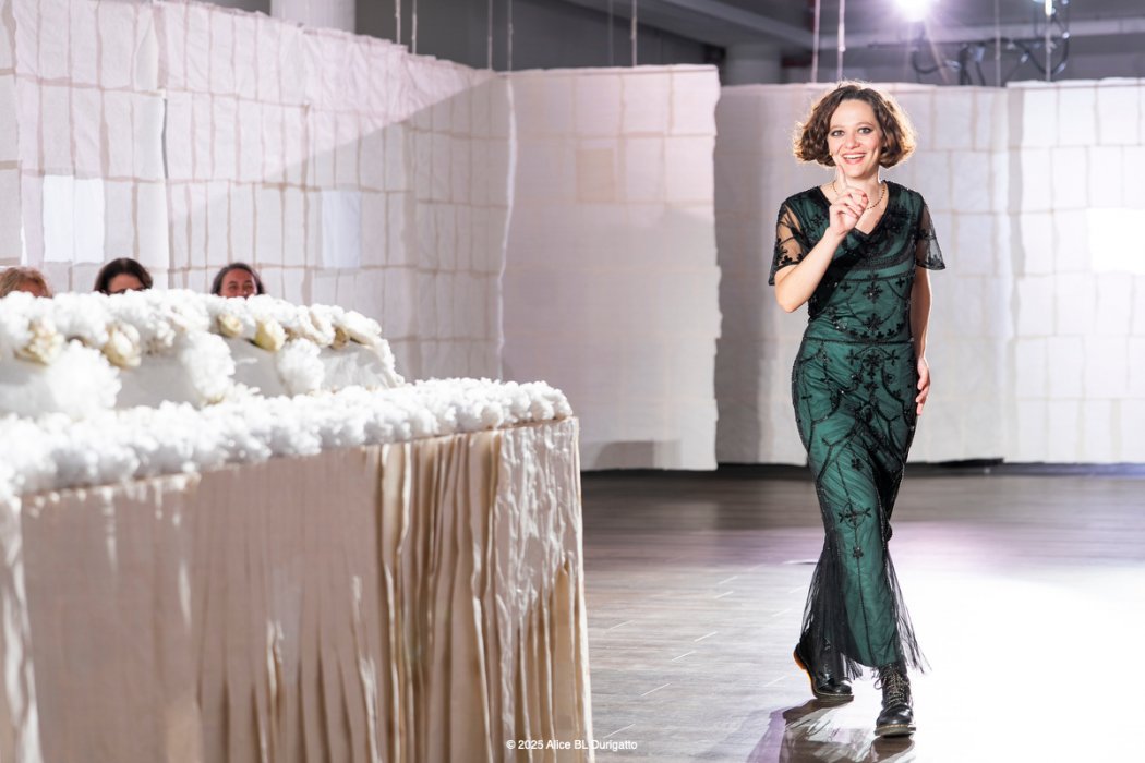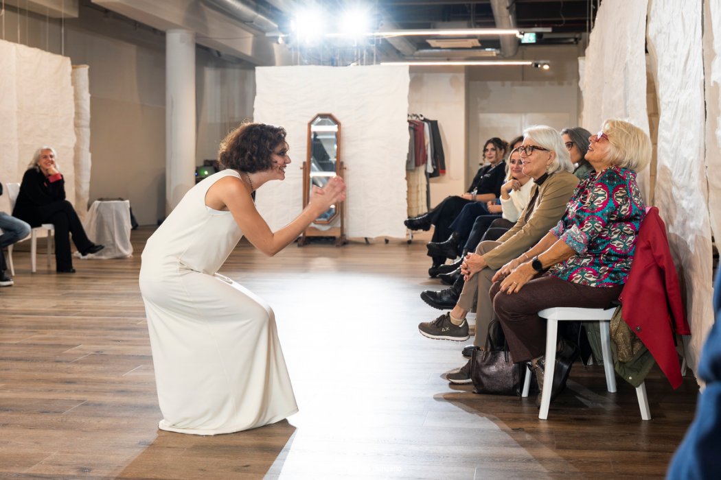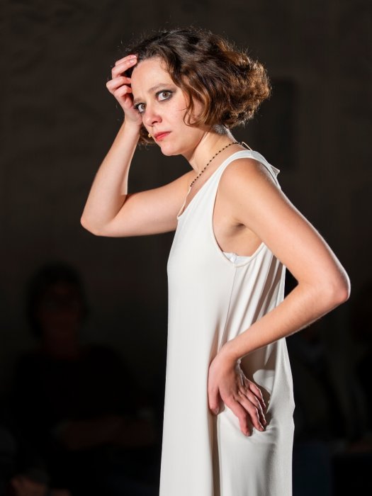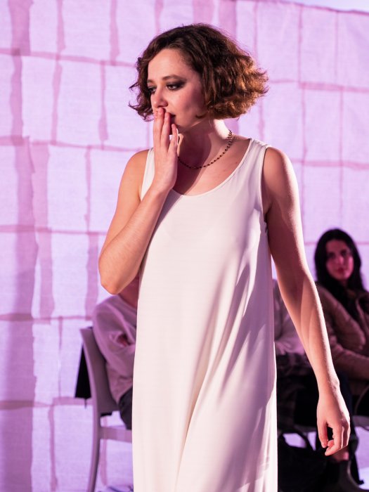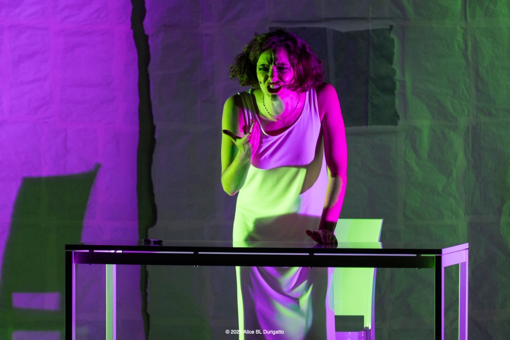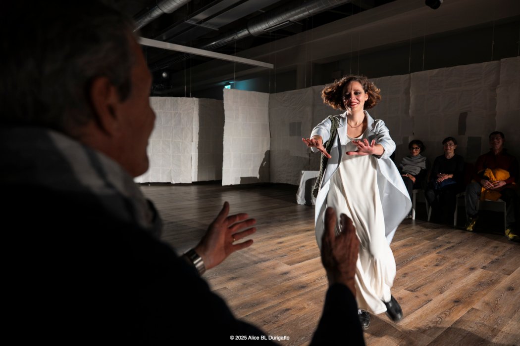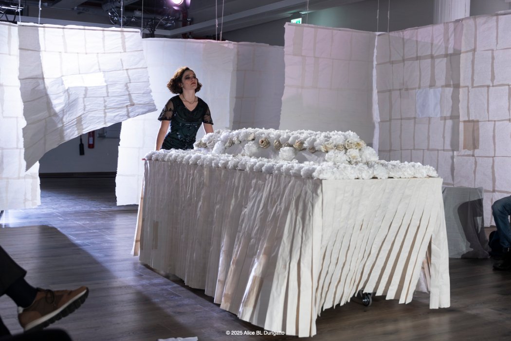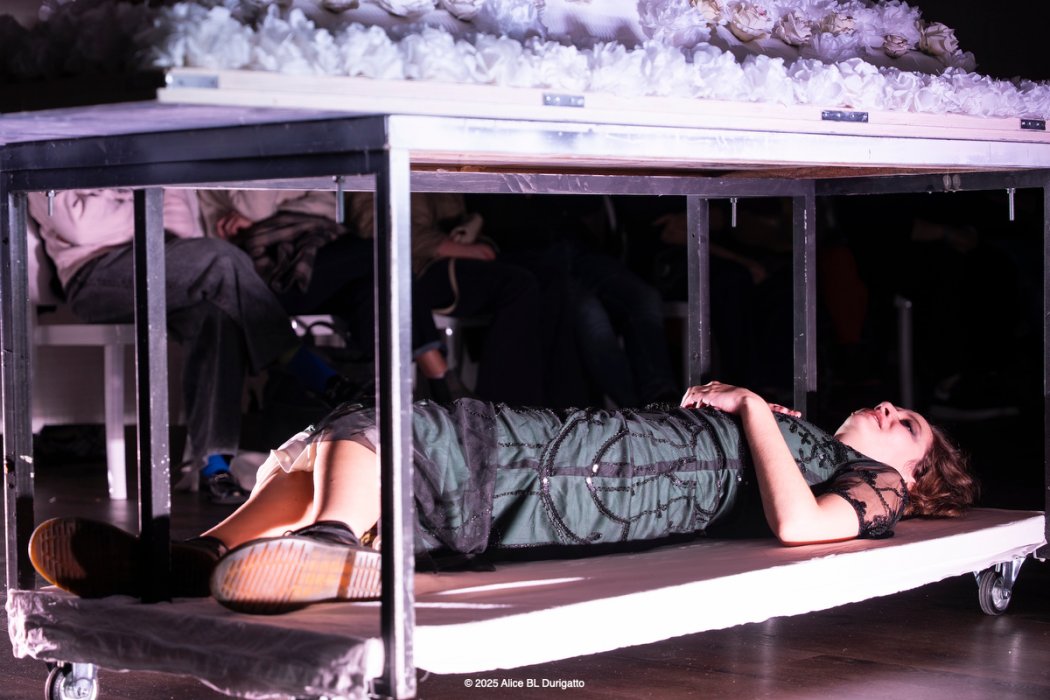 La messinscena sceglie di portare gli spettatori all’interno dello spazio scenico, ospiti dello spettacolo che è la festa di Clarissa Dalloway, mentre altrove qualcuno muore. Entriamo nella pagina bianca dove prende forma il romanzo, attori e attrici privilegiati di un mondo in cui, dietro le quinte, arrivano echi di guerra. E qualcuno muore perché la nostra festa possa continuare.
