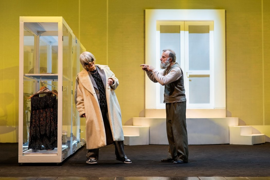 La regia di Saravo ambienta lo spettacolo in una dimensione che rimanda al nostro quotidiano, giostrando riferimenti temporali diversi, dagli smartphone agli abiti anni Settanta agli spot che tormentano Arpagone. Anche le musiche originali di Paolo Silvestri si muovono su piani diversi, mentre la nuova traduzione di Letizia Russo, fresca e diretta, contribuisce a dare al tutto un ritmo contemporaneo. A fianco di Ugo Dighero, Mariangeles Torres è impegnata in un doppio ruolo: sarà Freccia, il servitore che sottrae la cassetta di denaro di Arpagone, e la domestica/mezzana Frosina, ovvero i due personaggi che muovono l’azione, scatenando l’irresistibile gioco degli equivoci, sino al ribaltamento di tutte le carte in tavola.