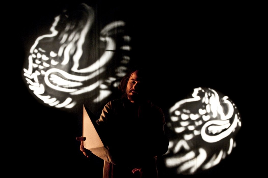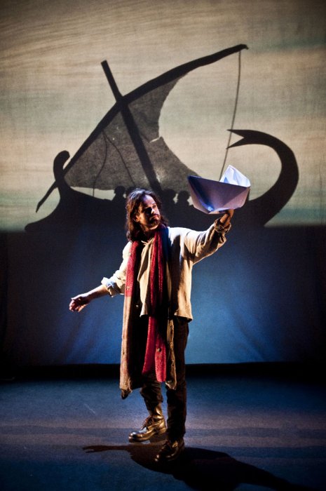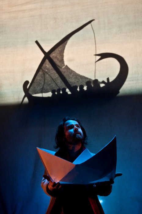 Flavio Albanese inizia così il suo viaggio nel mondo di Ulisse, invitando i giovani spettatori ad “entrare” nell’Odissea e nel suo immaginario, popolato da dei, eroi e creature magiche. Prota­gonista dello spettacolo è la parola, unita al fascino delle figure d’ombra, opera del grande scenografo Emanuele Luzzati e re­alizzate da Teatro Gioco Vita: immagini vivide, capaci di ricrea­re nello spazio teatrale la magia, ingrediente fondamentale del racconto omerico.